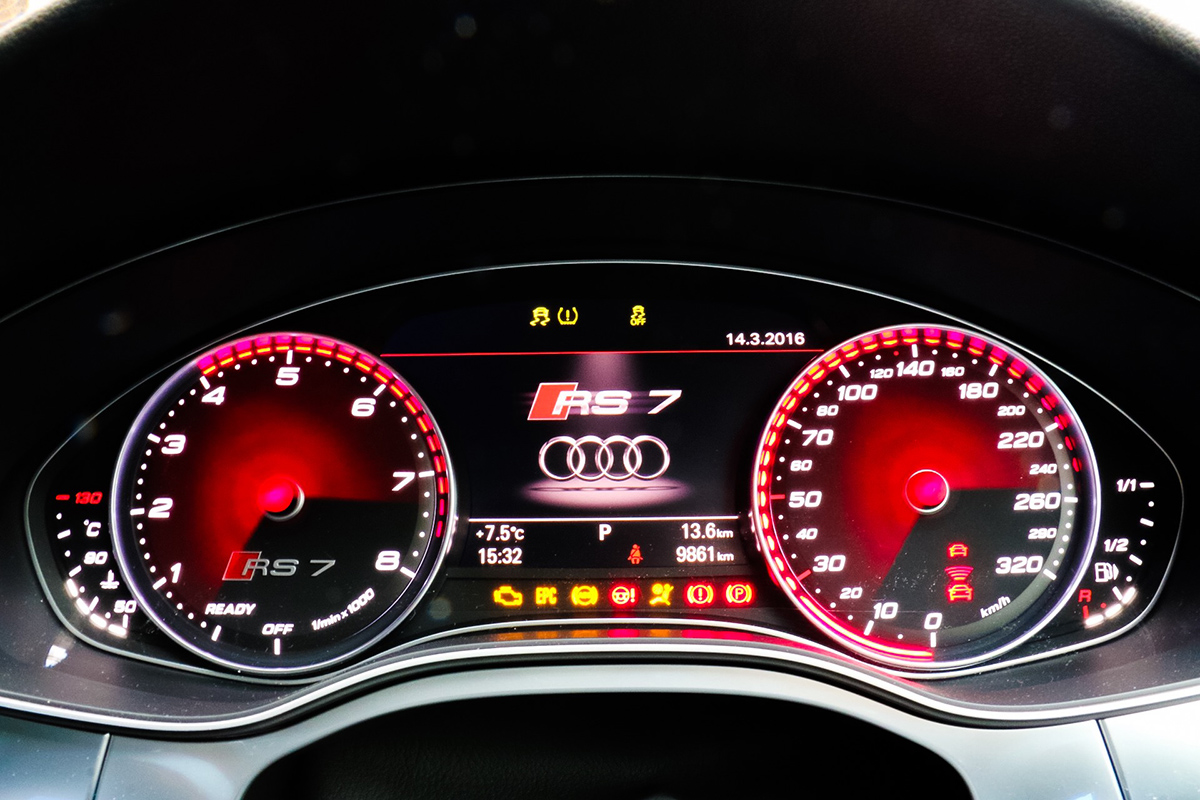 De Audi heeft alles in zich om niet alleen performance limousines het leven zuur te maken, sportwagens mogen de borst trouwens ook natmaken want de V8 sleurt de sportlimousine heel hard van zijn plek. Zodra je op de snelweg een dikkere A7 achter je ziet met in de grille het woord Quattro dan kun je het beste gelijk plek maken. De RS7 kan makkelijk meer dan 300 km/u halen al wordt de topsnelheid standaard op 250 km/u afgeregeld. Veel te weinig voor een Audi met 560 pk en 700 Nm aan koppel. Dankzij de befaamde Quattro vierwielaandrijving versnelt de Duitser in 3,9 seconden naar de 100 km/u als het gaspedaal vol naar beneden gaat. Dat is langzamer dan de Mercedes-Benz E63 AMG S en dat is erg verrassend, maar wel weer een stuk sneller dan BMW's M5. De RS7 is net zoals ieder ander RS-model te herkennen aan de dikkere bumperpartij, een andere grille, carbon fiber elementen en ovale uitlaten. Binnenin is alles net wat sportiever aangekleed maar nog altijd wel zakelijk zoals dat hoort bij Audi.