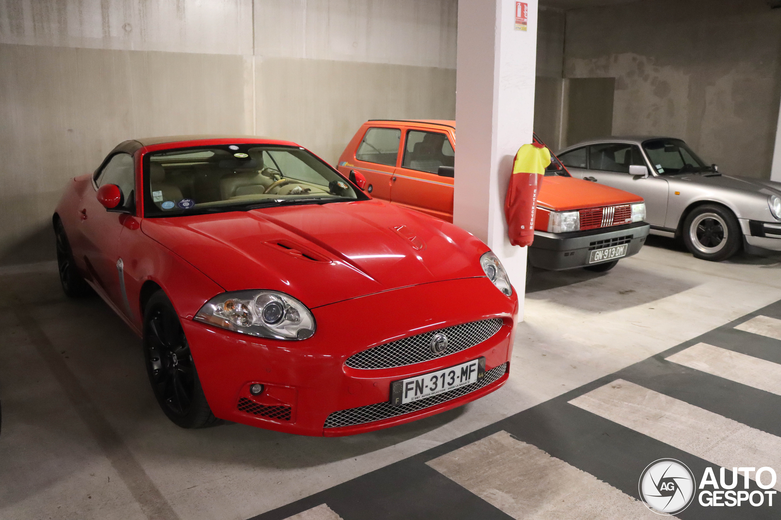 Door met het rode thema, met nu even een uitstapje naar de Franse westkust. In 2023 liep ik in de badplaats La Baule even de garage in waar we boven stonden geparkeerd, toch even kijken of er iets leuks stond. En dat stond er zeker. Natuurlijk deze rode XKR, sowieso een bijzondere verschijning in rood. Maar er stonden meer pareltjes; drie Porsches, een eerste generatie Panda in bijna-nieuwstaat en als topper een Daimler DS420, waarschijnlijk in bezit geweest van het Britse koningshuis. Wat een bijzondere combo!