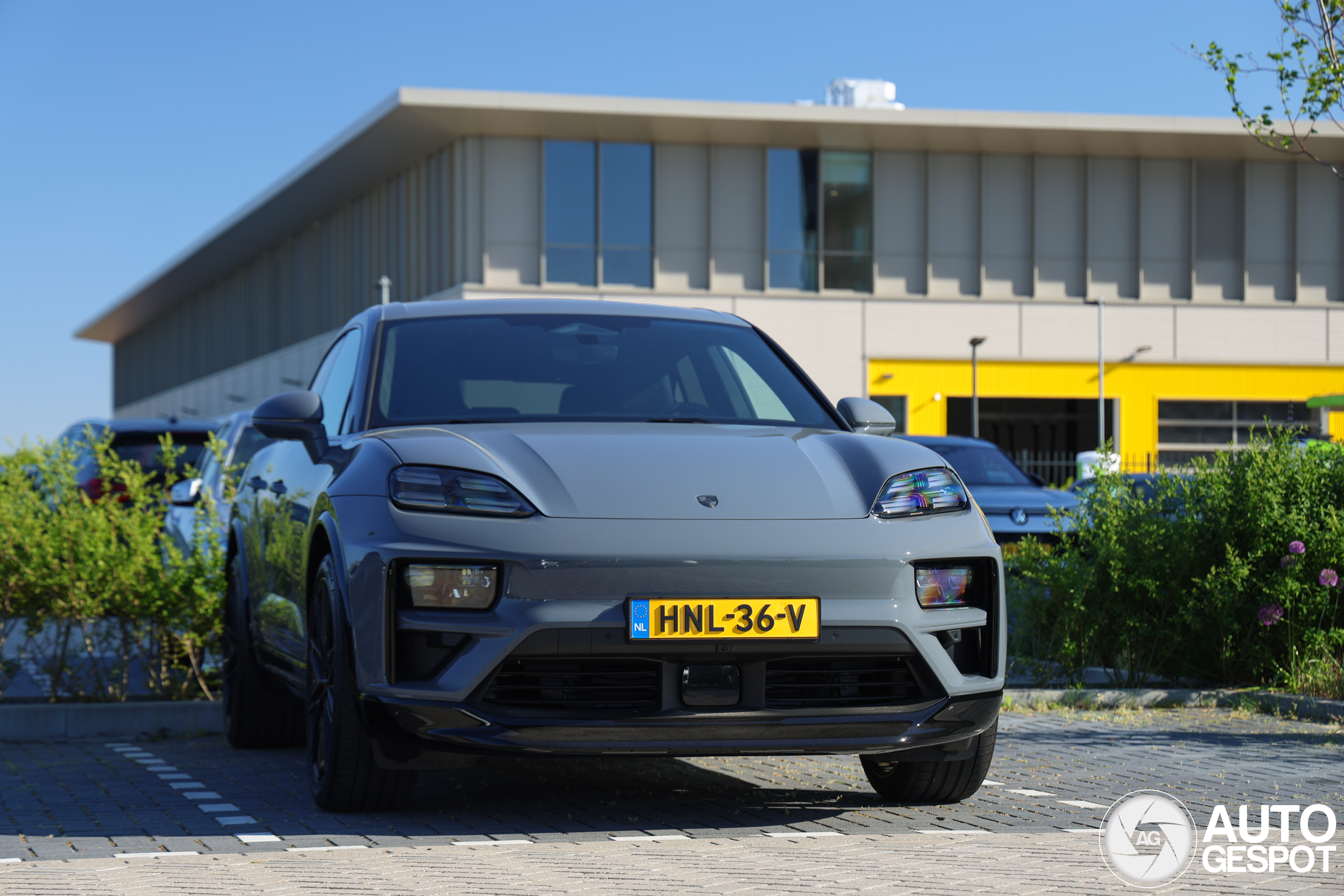 Naast een smurfblauwe Porsche Carrera stond ook deze Macan EV Turbo op het parkeerterrein!
