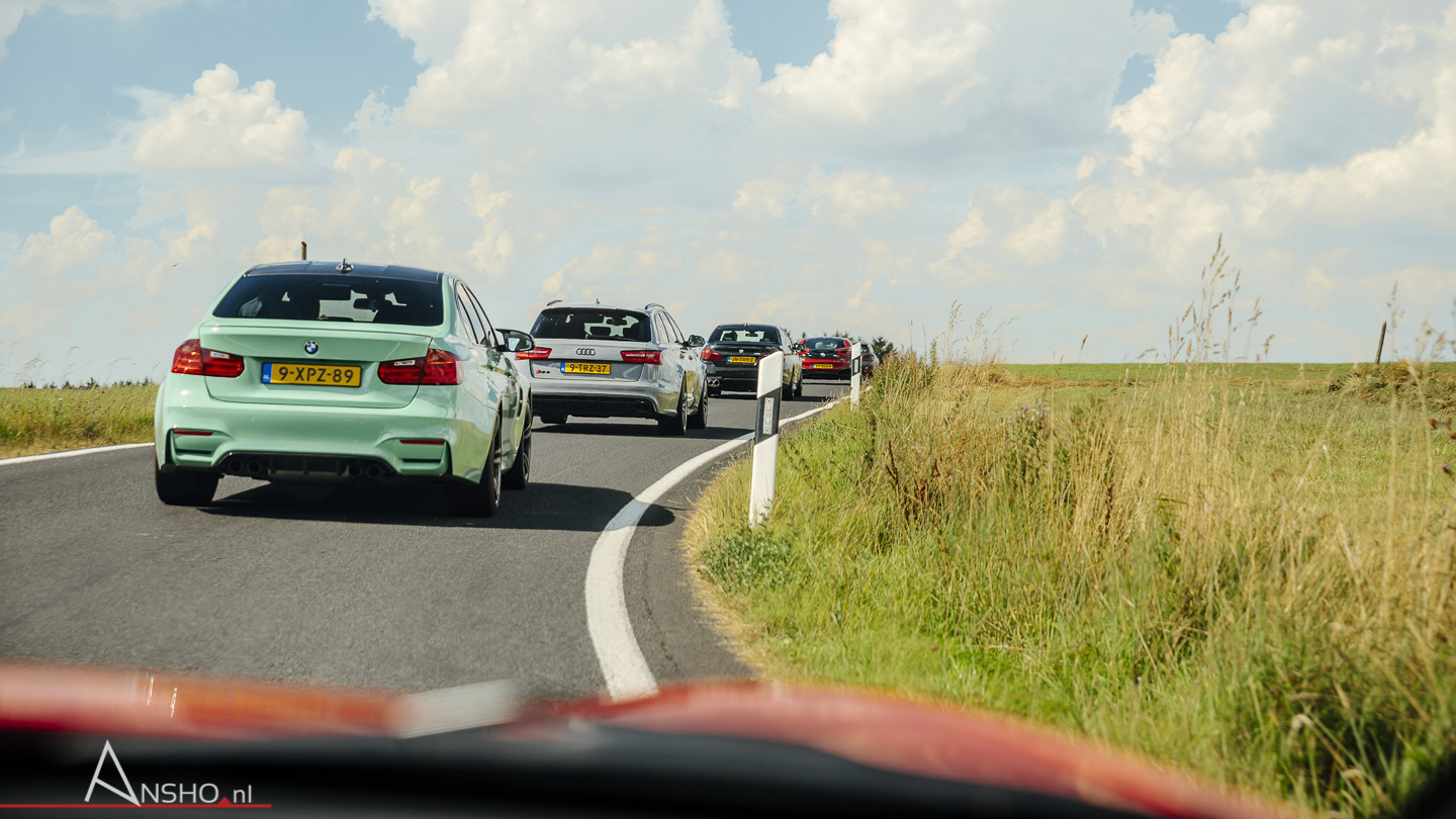 Het is klokslag 12.00 uur als we ons welkomstpraatje houden en daarbij iedereen welkom heten en van de laatste informatie voorzien. Meteen daarna worden de motoren gestart om koers te zetten richting Duitsland. In Nederland wordt het gas netjes in toom gehouden en wordt de maximum snelheid gerespecteerd. Pas wanneer we de Duitse grens overzijn en de limieten zijn opgeheven gaat het gas er vol op.